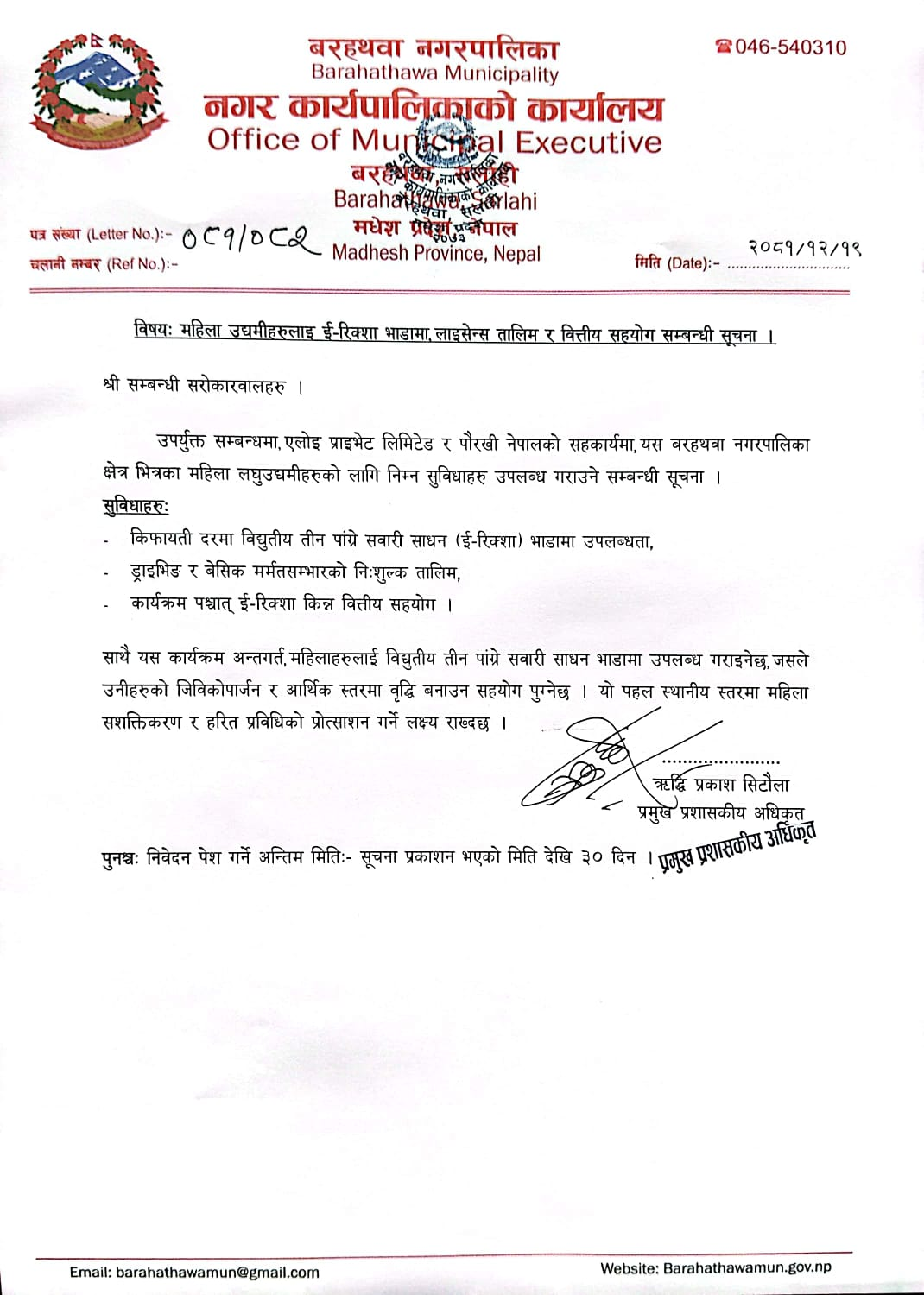 महिलालाई स्वरोजगार बनाउन भाडामा ई-रिक्सा दिँदै बरहथवा नगरपालिका, ड्राइभिङ तालिम नि:शुल्क