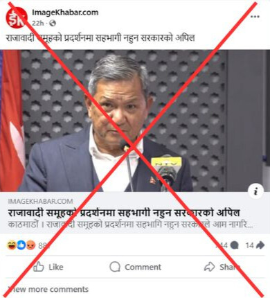 १ अप्रिल, २०२५ मङ्गलबार दिउँसो ४:०७ बजेको समयमा इमेजखबरको फेसबुक पेजमा ‘राजावादी समूहको प्रदर्शनमा सहभागी नहुन सरकारको अपिल’ शीर्षक सहितको समाचार प्रकाशन भएको देखिन्छ । फेसबुकमा शेयर गरिएको उक्त समाचारमा फ्याक्ट चेक गर्दाको समयमा ८७९ रियाक्ट, ७३६ कमेन्ट आएका छन् भने समाचार १४ जनाले शेयर गरेका छन् । हेर्नुहोस् उक्त समाचारको ओरिजिनल फेसबुक लिङ्क र आर्काइभ फेसबुक लिङ्क । ओरिजिनल वेब लिङ्क र आर्काइभ वेब लिङ्क ।