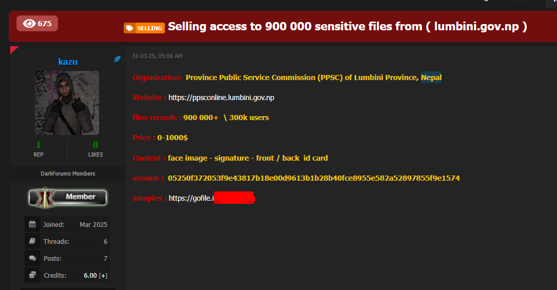 ह्याकर समूहले डार्क फोरममा प्रदेश लोक सेवा आयोगको वेबसाइट (ppsconline.lumbini.gov.np) को डेटा एक हजार अमेरिकी डलर (करिब एक लाख ३७ हजार रुपैयाँ) मा बिक्रीमा राखेको उल्लेख छ ।
