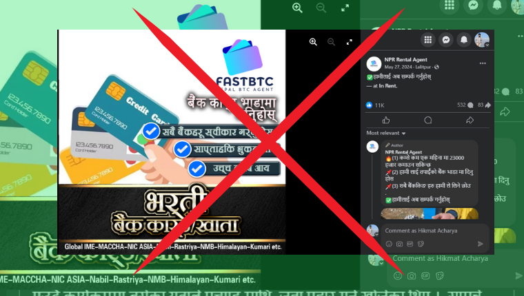 यो सामग्री तयार पार्दासम्म उक्त पोस्टमा ११ हजार बढी रियाक्सन, ५३२ बढी कमेन्ट र ८३ शेयर आएका छन् । पोस्टको क्याप्सनमा ‘हामीलाई सम्पर्क गर्नुहोस्’ लेखिएको छ । त्यसमा अपलोड भएको फोटोमा भने ‘बैंक कार्ड भाडामा लिनुहोस्’, ‘सबै बैंक अकाउन्ट स्वीकार गर्नुहोस्’, ‘साप्ताहिक भुक्तानी’, ‘उच्च तलब आय’ लेखिएको छ । शब्द भने मिलेका देखिंदैनन् ।