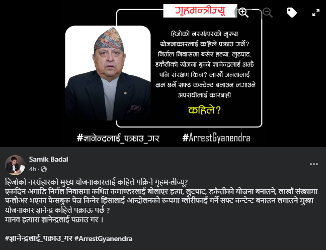 फेसबुकमा नेकपा एमाले निकट विद्यार्थी संगठन अनेरास्ववियुका अध्यक्ष समिक बडालले लेखेका छन्, “हिजोको नरसंहारको मुख्य योजनाकारलाई कहिले पक्रिने गृहमन्त्रीज्यू ? एकदिन अगाडि निर्मल निवासमा कथित कमाण्डरलाई बोलाएर हत्या, लुटपाट, डकैतीको योजना बनाउने, लाखौं संख्यामा फलोअर भएका फेसबुक पेज किनेर हिंसालाई आन्दोलनको रूपमा ग्लोरीफाई गर्ने सफ्ट कन्टेन्ट बनाउन लगाउने मुख्य योजनाकार ज्ञानेन्द्र कहिले पक्राऊ पर्छ ? मानव हत्यारा ज्ञानेन्द्रलाई पक्राउ गर ।”