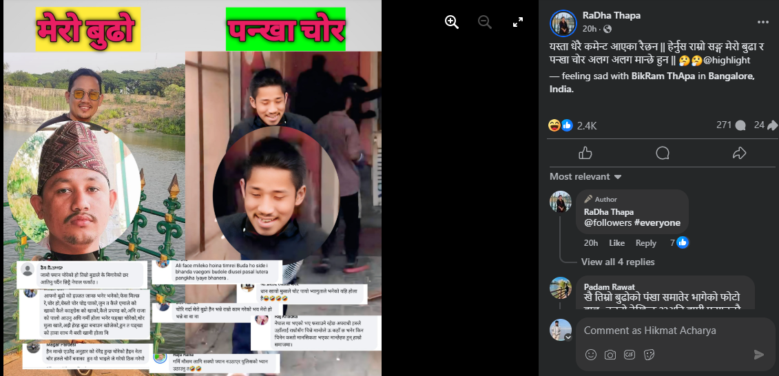 थापाले शनिबार आफ्नो श्रीमानको फोटो र पङ्खा उठाउँदै गरेका युवकको फोटो राख्दै, यी दुई व्यक्ति अलग अलग मान्छे भएको उल्लेख गरेकी थिइन् । उनले लेखेकी छिन्, “यस्ता धेरै कमेन्ट आएका रैछन् । हेर्नुस् राम्रोसँग मेरो बुढा र पङ्खा चोर अलग अलग मान्छे हुन् ।”